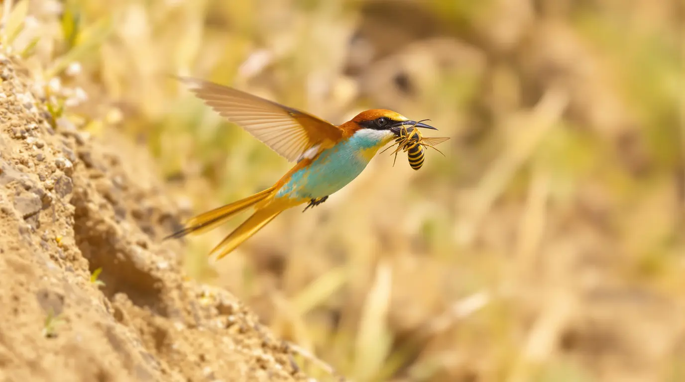Le sujet surprend, mais il est sérieux. Le guêpier d’Europe mange des insectes volants, dont certains frelons. Il repère sa proie à distance, l’attrape en plein vol, puis l’assomme contre une branche avant de l’avaler. Sa méthode est précise, rapide et très efficace.